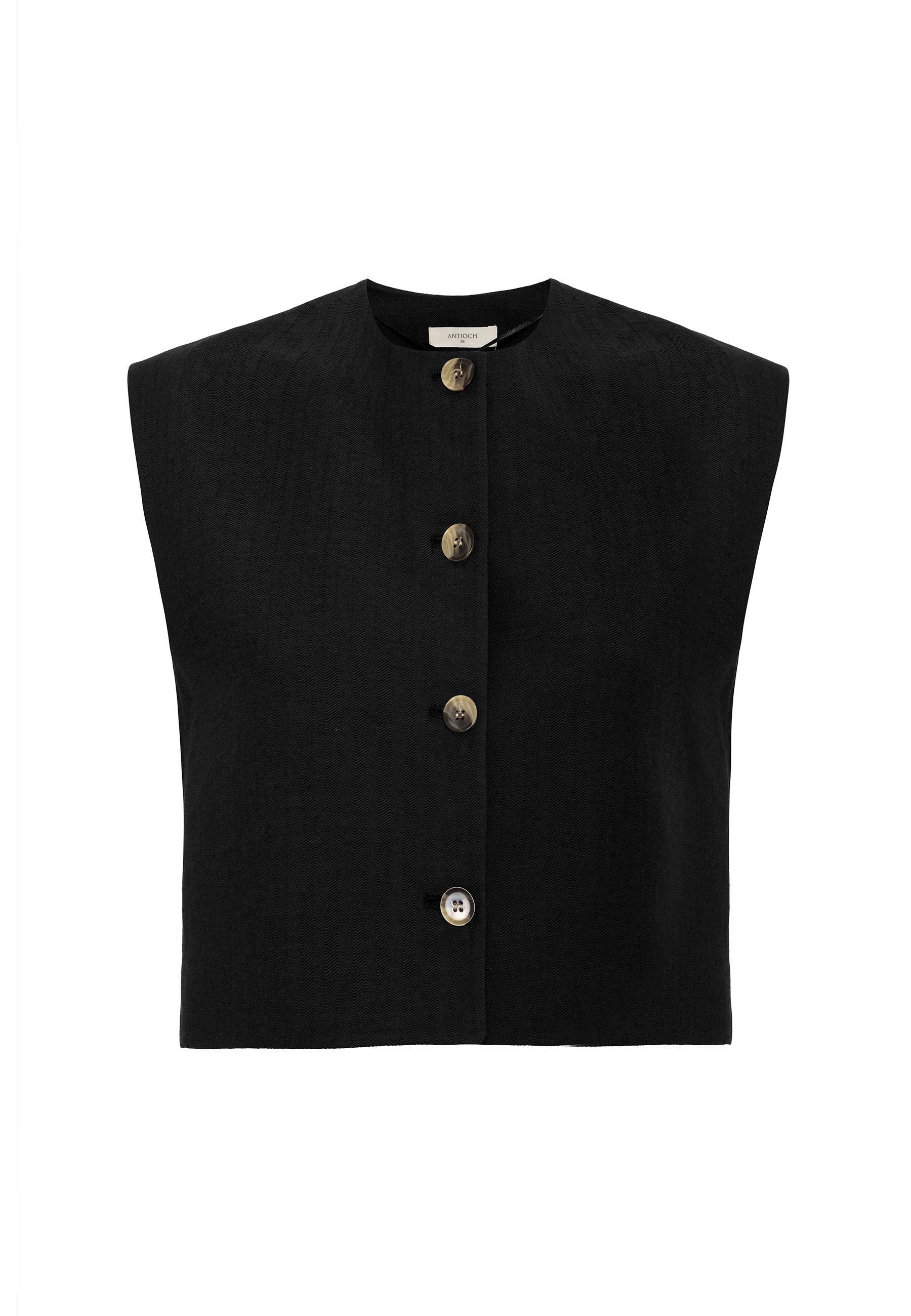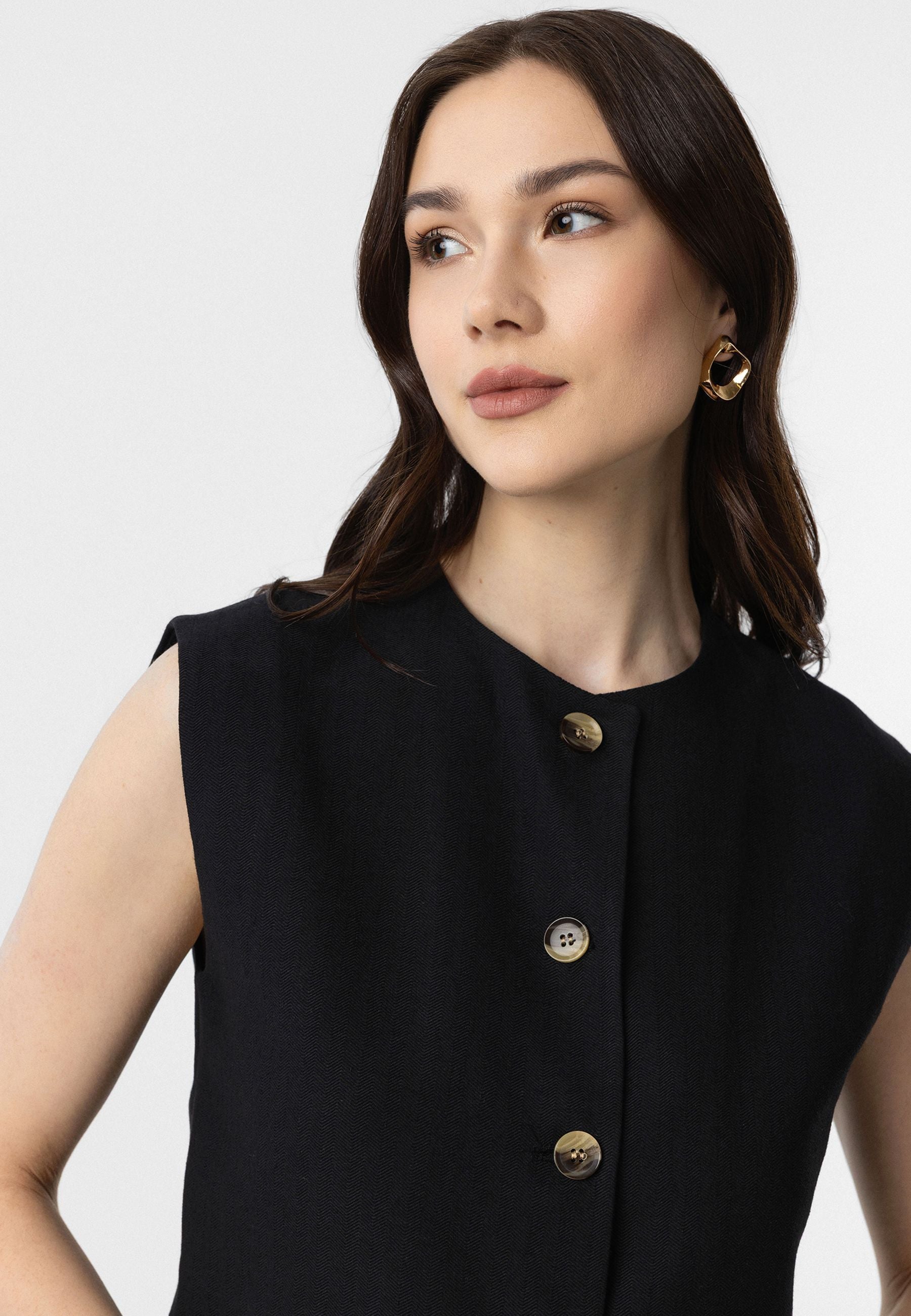 Sleeveless, Cropped Waistcoat. Material 46% Cotton 38% Viscose 16% Linen. Do not tumble dry, Dry clean only, do not wash, Do not iron, do not bleach. Our Model is 177 cm tall and is wearing size 36